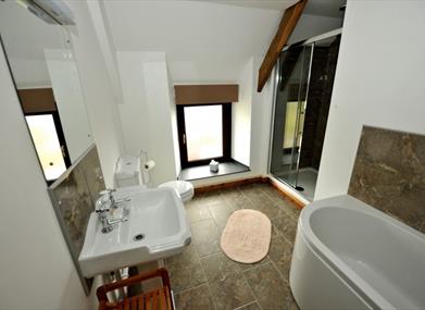 Mae gan ystafell ymolchi llawr gwaelod gawod, toiled a sinc.
