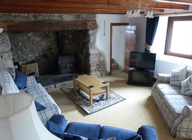 Mae gan yr ystafell fyw le tân inglenook â stôf llosgi pren, teledu Freeview lliw a chwaraewyr DVD â drysau dwbl sy'n arwain i'r patio.