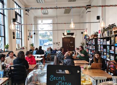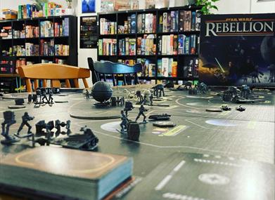 P'un a ydych yn chwilio am gêm barti lle mae’n rhaid i chi feddwl yn chwim neu rywbeth mwy dwys a strategol, mae gennym rywbeth ar eich cyfer. Wrth i chi chwarae, gallwch fwynhau ein bwydlen lysieuol o fyrbrydau a phrydau bach, gyda'n detholiad o gyrfau crefft, diodydd meddal Masnach Deg neu goffi wedi'i rostio'n annibynnol i dorri'ch syched. Rydym ar groesffordd St Helen’s Road a Bryn y Môr Road.