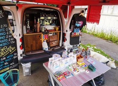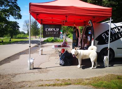 Fan coffi symudol ym Mharc Singleton sy'n gwerthu coffi, te a choco poeth.