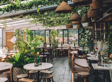 Ymunwch â ni ym mar pen to Gin & Juice sy'n cynnig golygfeydd syfrdanol o lan môr y Mwmbwls.