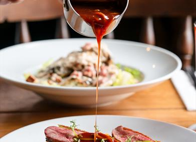 Gallwch fwynhau pryd o fwyd yn ein bwyty, yn Ystafell Gŵyr neu yn y prif far. Rydym yn enwog am ein prydau cartref sy'n amrywio o brydau tafarn sylweddol i bysgod blasus sydd wedi'u dal yn lleol a helgig tymhorol sydd ar gael ar ein bwydlen arbennig. Rydym yn ceisio defnyddio cymaint o gynnyrch lleol a Chymreig â phosib ar gyfer ein bwydlenni.