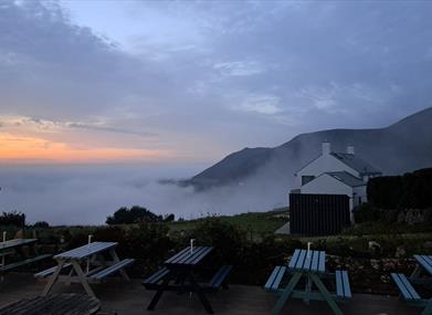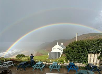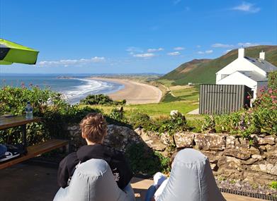 Mae 'The View' yn sefyll ar ben clogwyni Rhosili, gan edrych dros Fynydd Rhosili i'r dde, a thraeth eang Bae Rhosili.